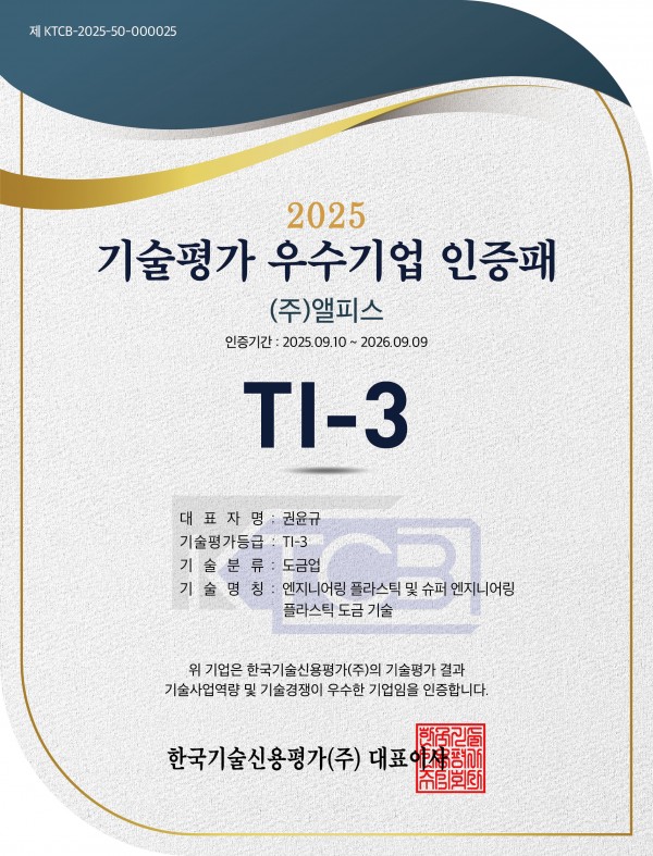 중소기업이 받을 수 있는 최고 등급으로 엔지니어링 플라스틱 및 슈퍼 엔지니어링 플라스틱 도금 기술 분야에서 탁월한 기술력과 경쟁력을 인정받은 결과로, 당사 기술사업 역량과 성장 잠재성이 외부 기관으로부터 객관적으로 평가받았습니다.